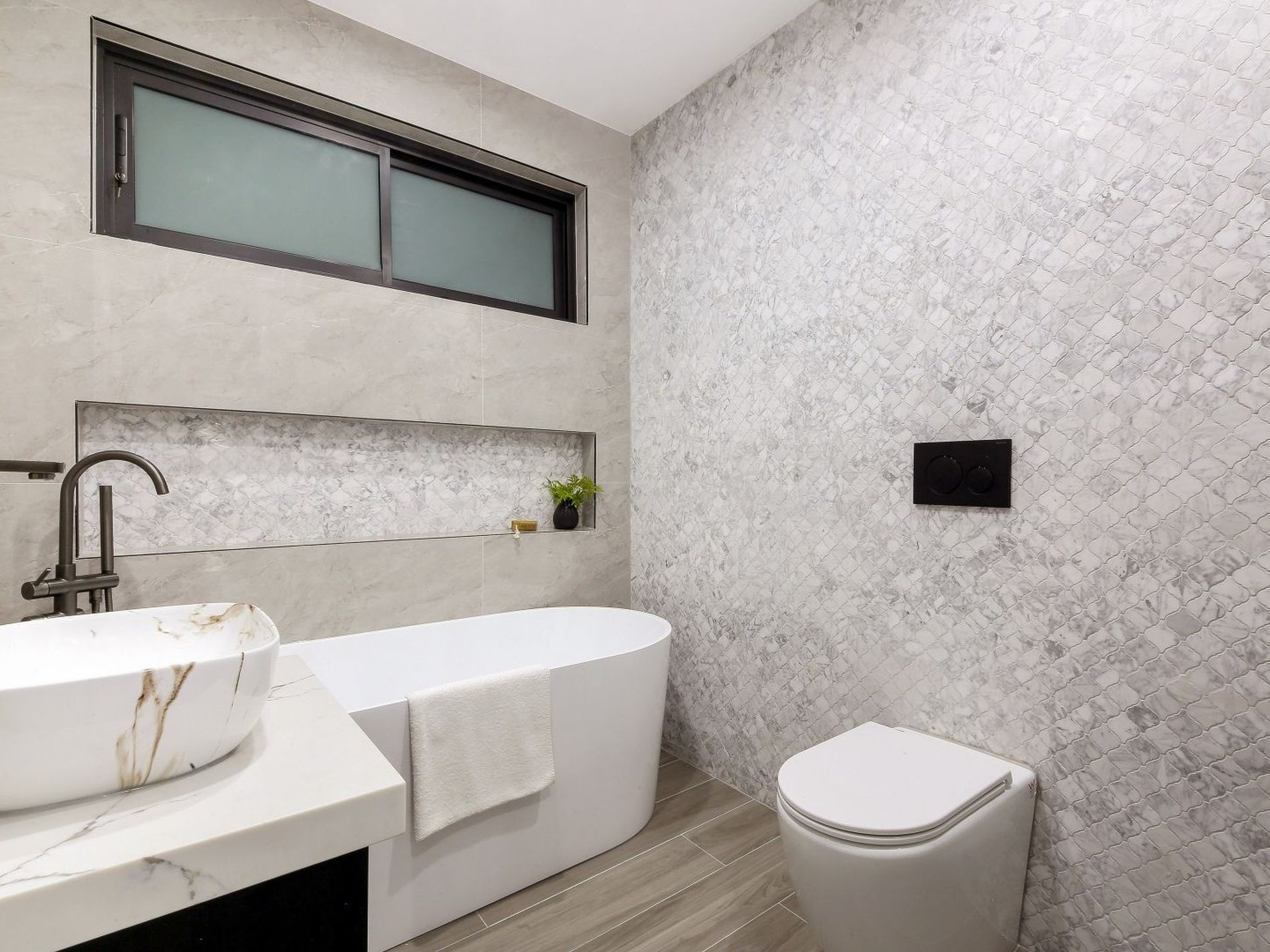 • Three modern bathrooms, including a main with freestanding bathtub and separate shower.