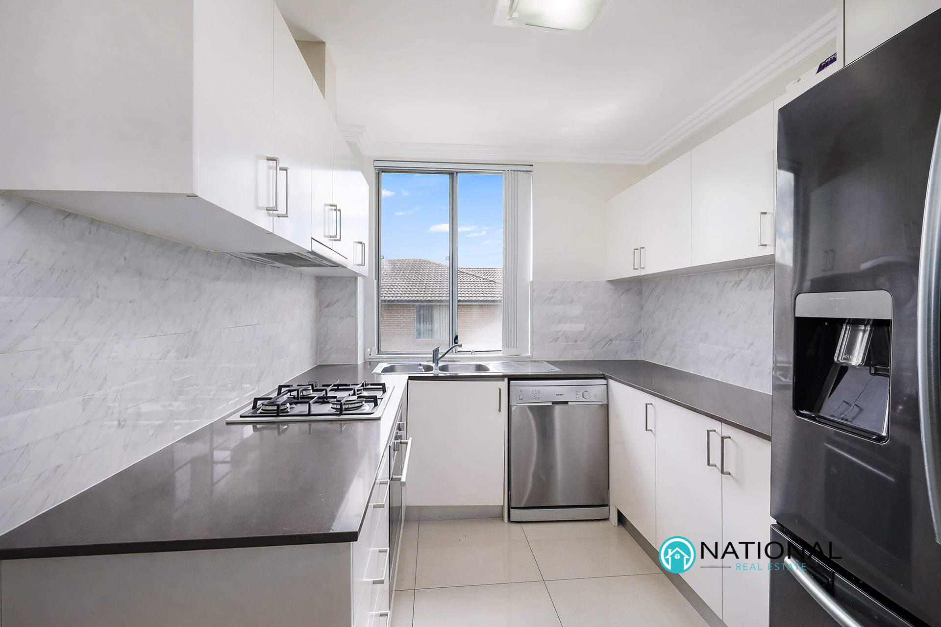 The contemporary kitchen is both stylish and practical, featuring gas cooking, stone benchtops, quality appliances including dishwasher, and ample cupboard space, ideal for home cooks who value functionality without compromising on design.